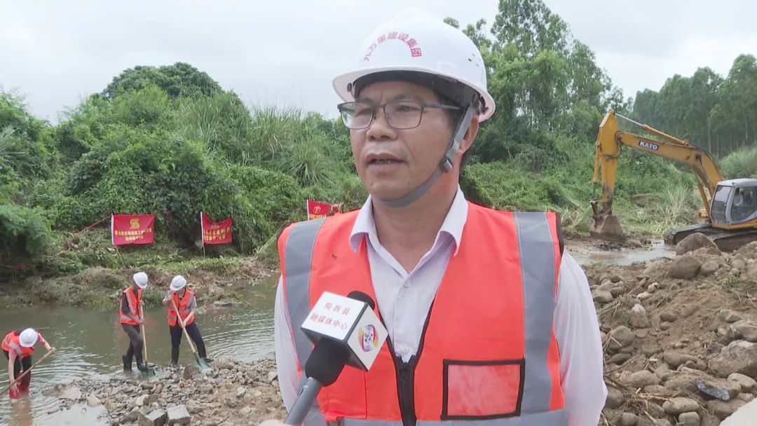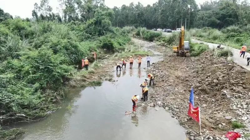 雙水村委會崩陂河,水陂的側(cè)邊陂體已被河水沖垮,河道全是散落的石頭和泥沙,如不及時搶險,再遇到降雨將會導(dǎo)致路基損毀和下游農(nóng)田被淹。三家企業(yè)自發(fā)組建的搶險救災(zāi)隊伍在現(xiàn)場利用機(jī)械和人力,對河道進(jìn)行疏通,將陂體的泥沙進(jìn)行回填。