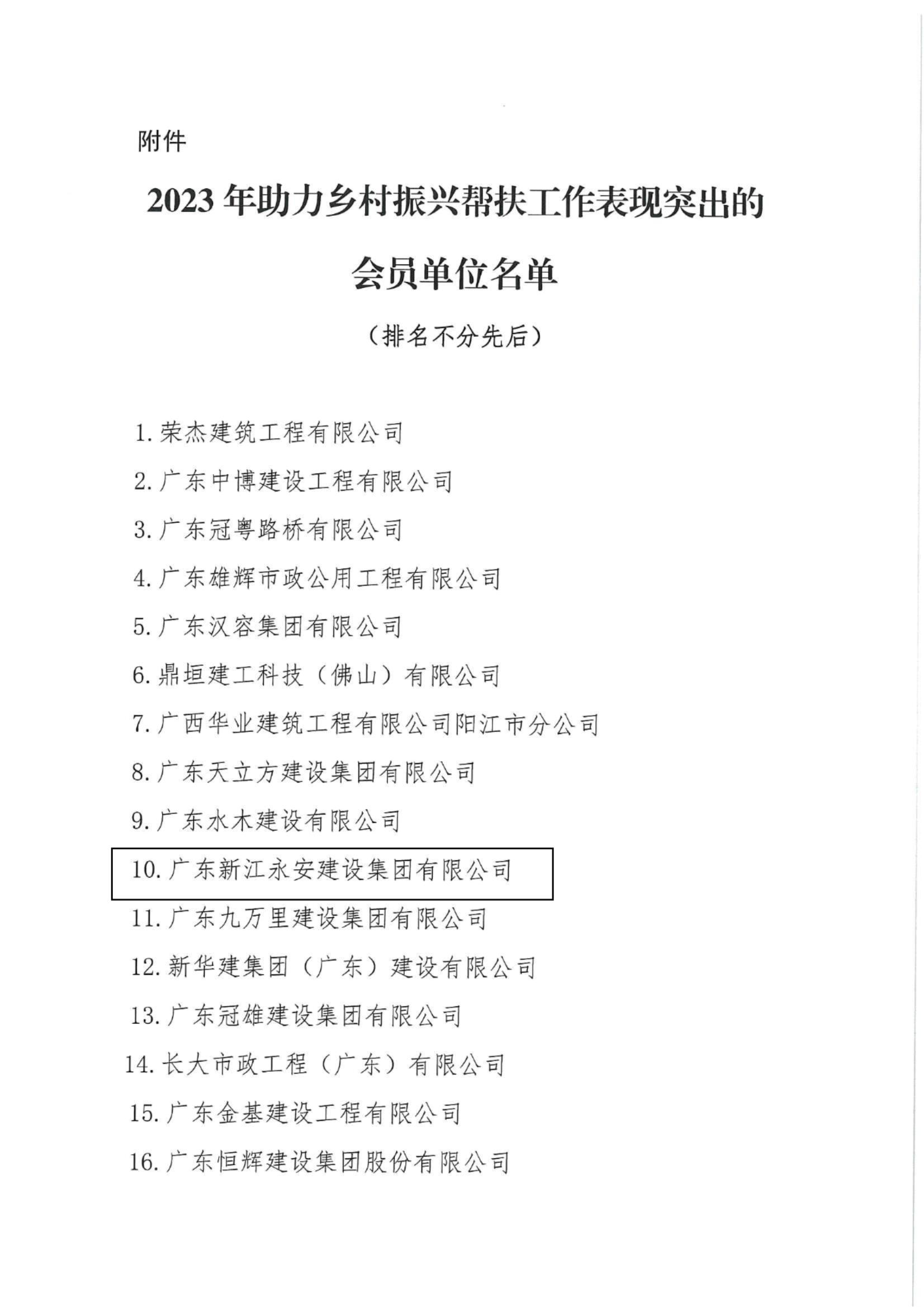 關(guān)于對(duì)助力鄉(xiāng)村振興幫扶工作表現(xiàn)突出單位進(jìn)行通報(bào)表揚(yáng)的決定各會(huì)員單位: 我會(huì)秉承“飲水思源,回報(bào)社會(huì)”的理念,制定了《廣東省市政行業(yè)協(xié)會(huì)鄉(xiāng)村振興活動(dòng)方案》,發(fā)動(dòng)廣大會(huì)員單位共同參與鄉(xiāng)村振興活動(dòng),助力粵東西北貧困地區(qū)建設(shè)項(xiàng)目幫扶服務(wù)或產(chǎn)業(yè)對(duì)口合作,得到了當(dāng)?shù)卣腿嗣袢罕姷母叨仍u(píng)價(jià)為全省市政企業(yè)助力鄉(xiāng)村振興做好典型示范工作。 為表揚(yáng)先進(jìn)、弘揚(yáng)正氣,經(jīng)研究決定,我會(huì)對(duì)榮杰建筑工程有限公司等 37 家積極參與助力鄉(xiāng)村振興幫扶工作表現(xiàn)突出的會(huì)員單位予以通報(bào)表揚(yáng),希望受表揚(yáng)的會(huì)員單位再接再厲,發(fā)揮榜樣示范作用,引領(lǐng)我省廣大市政行業(yè)企業(yè)積極參與鄉(xiāng)村振興工作。希望全體會(huì)員單位向受表揚(yáng)的單位學(xué)習(xí)認(rèn)真貫徹落實(shí)黨的二十大報(bào)告關(guān)于推進(jìn)鄉(xiāng)村振興的精神和部署,在鄉(xiāng)村振興這個(gè)廣闊舞臺(tái)上發(fā)揮作用、體現(xiàn)價(jià)值、展現(xiàn)風(fēng)采,為推進(jìn)鄉(xiāng)村振興和“百縣千鎮(zhèn)萬村高質(zhì)量發(fā)展工程”,促進(jìn)城鄉(xiāng)區(qū)域協(xié)調(diào)發(fā)展做出更大貢獻(xiàn)展現(xiàn)廣東市政人的精神風(fēng)貌。 附件:2023 年助力鄉(xiāng)村振興幫扶工作表現(xiàn)突出的會(huì)員單位名單 廣東省市政行業(yè)協(xié)會(huì) 2024年1月5日